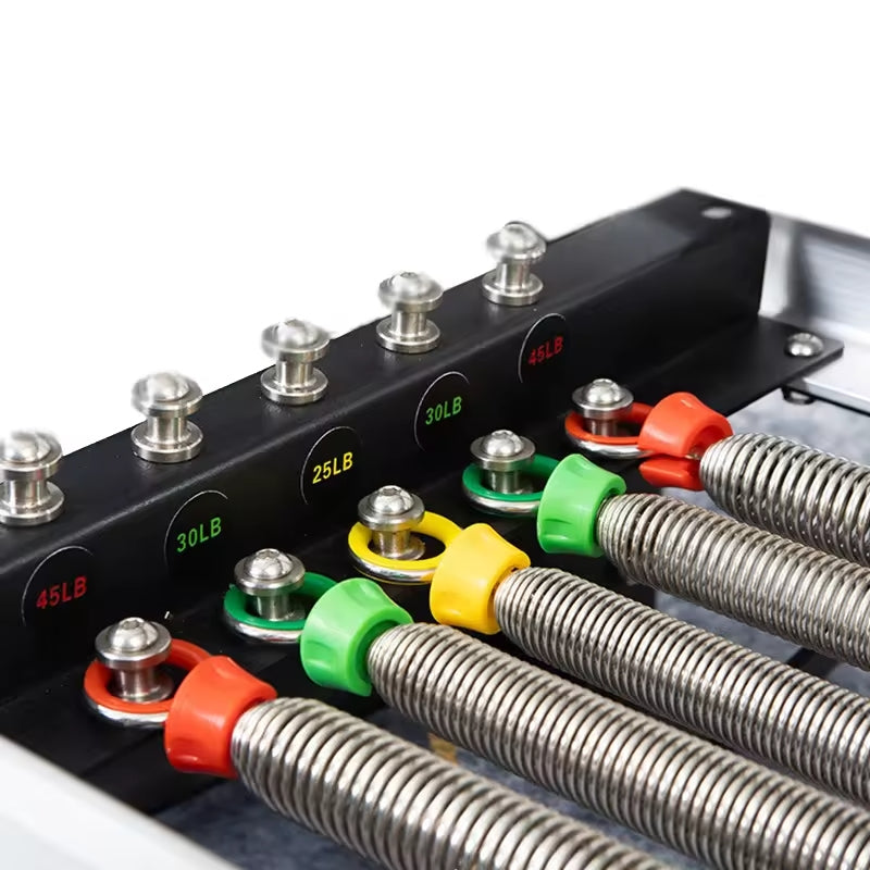 Système de ressorts 6 ressorts : 2 jaunes (légers), 2 verts (moyens), 2 rouges (forts)